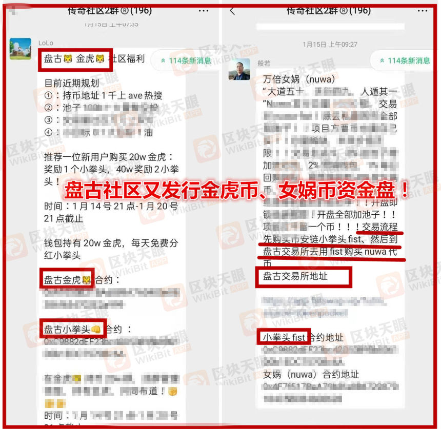 前段时间,各大平台揭发了“盘古社区”传销盘的“罪行”,没想到,过了几天,这个盘古社区由发行“拳头币FIST”、“奥斯卡币OSK”两个币衍生出更多的资金盘,比如近期在微信群里各种布道的“女娲币”、“金虎币”等等,公然在国内发行虚拟货币割韭菜!