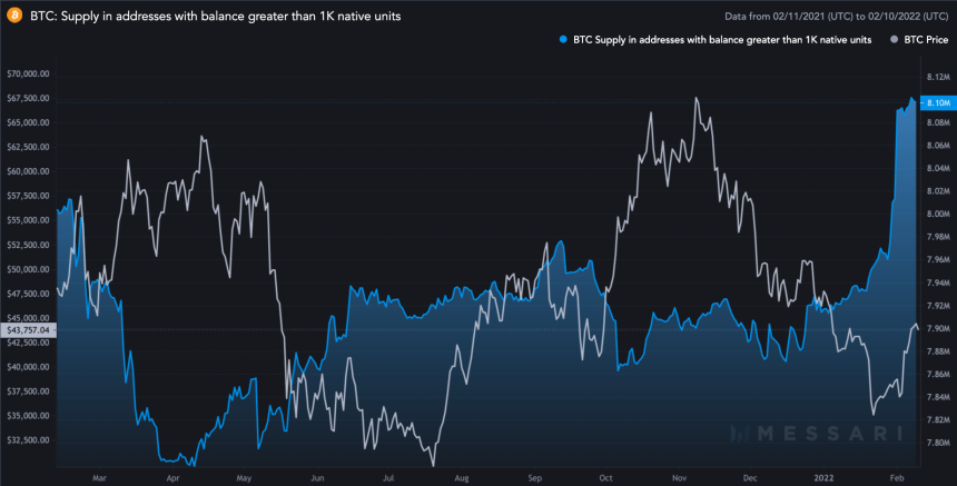 持有至少 1,000 个比特币地址,即所谓的鲸鱼,在最近的市场复苏期间已经开始增持更多的代币。根据 Coin Metrics的数据,截至 2 月 10 日,这些地址的总供应量为 809.6 万 个BTC,而 1 月 24 日为 795 万。