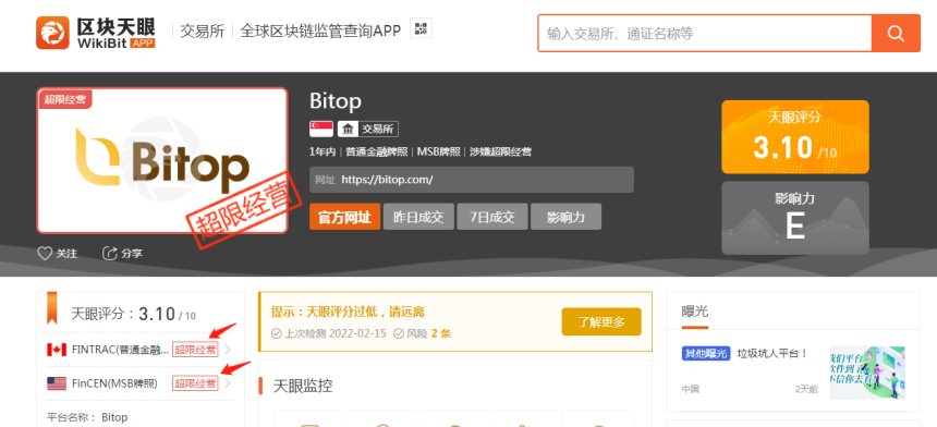 而在区块天眼APP上查看到,Bitop并未获得新加坡本土牌照。另外,之前获得的美国、加拿大颁发的金融服务牌照,也显示“超限运营”。