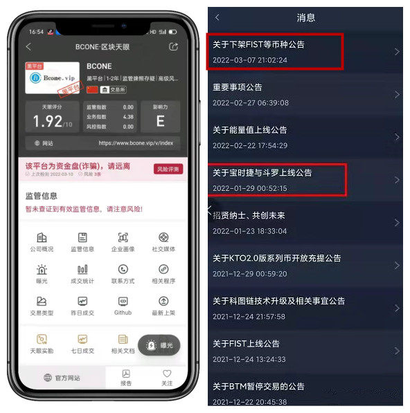 而这些害人不浅的传销币全部都上线了同一家平台——Bcone交易所。关于Bcone这个交易所,早就臭名昭著了,在过去这些年中,上线了很多垃圾币、归零币、传销币。通过区块天眼APP可以查看到,Bcone就是一家黑平台,评分仅1.92,本身有很大的跑路风险!