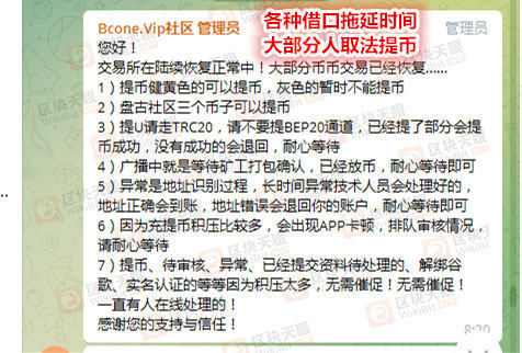 Bcone目前已经彻底无法提出任何资产了!官方客服已解散了所有的微信群,保留的其它社交平台也都开启了禁言模式。
