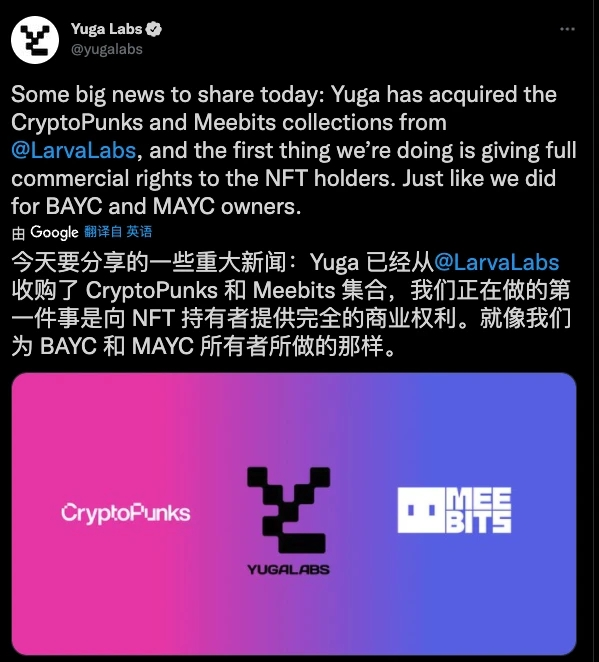 先是在3月12日,无聊猿BAYC母公司Yuga Labs对外宣布已经从 Larva Labs 收购 CryptoPunks 和 Meebits NFT 系列的知识产权或 IP。