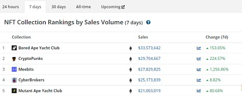 有人指出,Yuga本身就拥有BAYC和MAYC两大头部项目,如今又收购了CryptoPunks和Meebits,这四个项目分别位于NFT市值排行榜的第一、第二、第四、第六,累加市值甚至超过了NFT总市值的1/3。同时,这四个项目的7日累计交易量也全部跻身排行榜的前五名。头部项目的过度集中,难免会有垄断嫌疑,甚至会以抑制创新的方式对整个行业造成打击。
