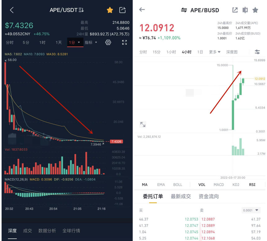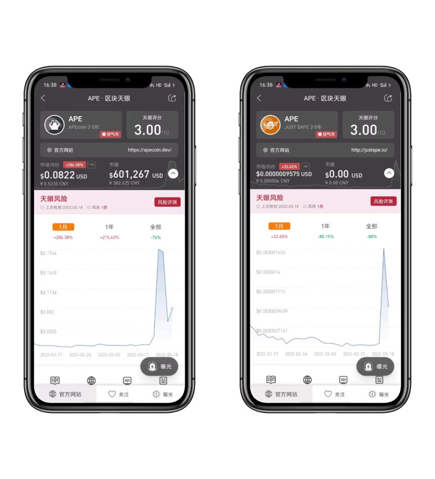 在区块天眼APP上可以查看到,多个空气币APE在3月17日这天暴涨,又给了项目方割韭菜的机会。