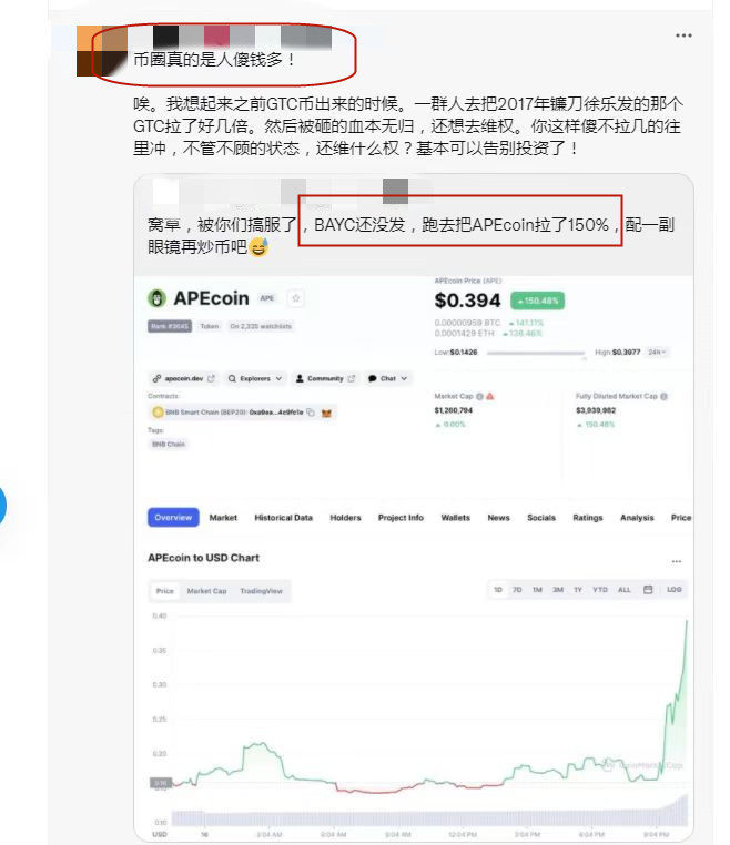 在BAYC的代币ApeCoin还未上线的时候,一些同名币就蹭着热度趁机拉了一把盘。就怕很多不明真相的币圈小白被忽悠进来当韭菜,果然还是没让人失望。