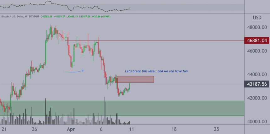 在周一的回调之后,van de Poppe 发布了一条后续推文,回应了43000美元的拒绝,并提出了需要关注的下一个支撑位。这位交易员表示,43,000 - 44,000美元区间的“绿区”需要成为支撑,才能保持看涨势头。