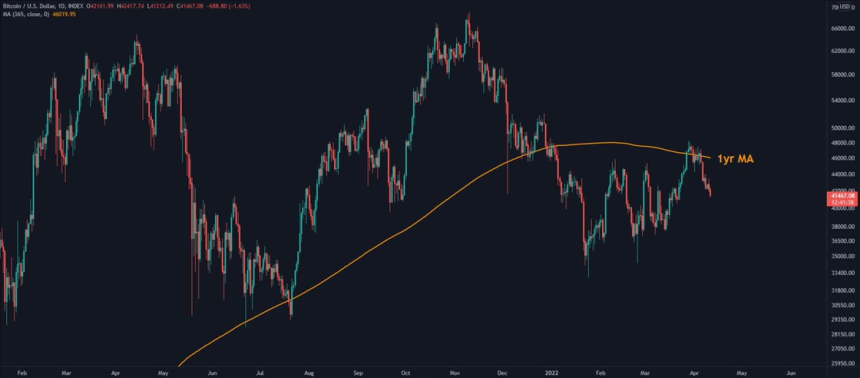 市场分析师兼 LookintoBitcoin 创始人 Philip Swift 提供了关于 BTC 价格未来的最后一点见解,他发布了下图,显示了最近价格拒绝 1 年移动平均线 (MA)。
