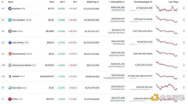 NFT总市值、市值排名前十项目 数据来源:Coinmarketcap
