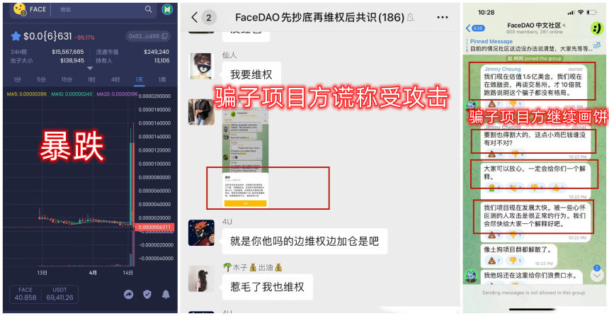 FOMO情绪正上头的时候,仿盘 FACE 突遭砸盘,币价一泻千里,韭菜又体会到了天上到地下的感觉。更可怕的是,骗子项目方割了韭菜,但不承认,找了个理由说是遭到了“攻击”,然后继续画大饼套路用户。