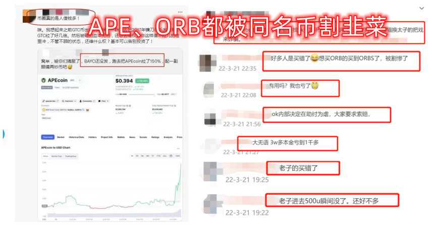 (1)NFT龙头项目BAYC的代币ApeCoin还未上线的时候,一些同名币就蹭着热度趁机拉了一把盘,不少韭菜被惨割。