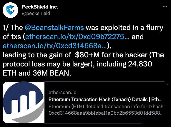 还有一件令人糟心的事件,算法稳定币项目Beanstalk Farms遭黑客攻击后损失1.8亿美元(合计人民币约11亿)。