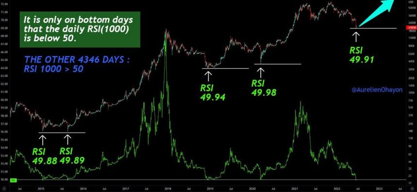 另一位在 BTC 图表上发现潜在看涨信号的交易者是 Twitter 用户 TAnalyst,他发布了以下图表,突出显示了相对强度指数 (RSI) 1000 的近期低点。