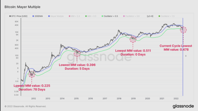 Glassnode还指出,Mayer Multiple 已跌破之前的周期低点。Mayer Multiple 指标是衡量比特币当前价格与 200 天移动平均线之间的差异。用于显示比特币价格在整个时间段内何时超买或超卖。更多区块链消息,请关注下载WikiBit APP,全球区块链监管查询APP。值得注意的是,随着市场变得更大、波动性降低,峰值变得不那么夸张。用于分析历史背景下的比特币价格在技术分析中,当价格高于长期移动平均线 (MA) 时,它通常被认为是看涨(或积极)指标,而当价格低于移动平均线时,它被认为是看跌(或消极)指标。