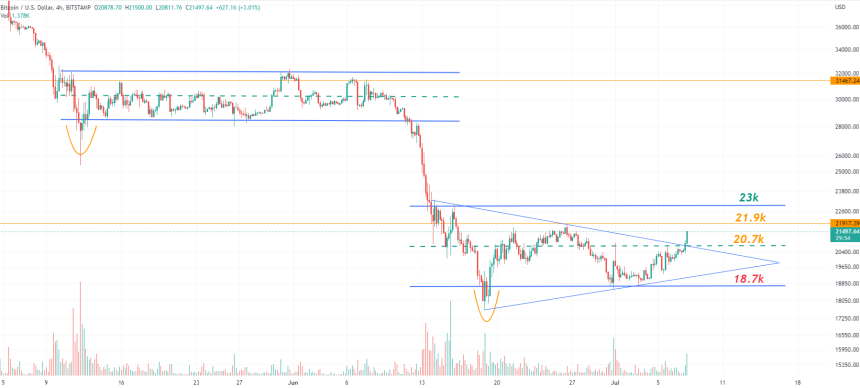 Cointelegraph Markets Pro 和 TradingView 的数据显示,在 7 月 7 日当天大部分时间的交易价格接近 20,400 美元后,比特币 (BTC) 的价格在下午时段(UTC)飙升近 7%,达到每日高点 21,860 美元。