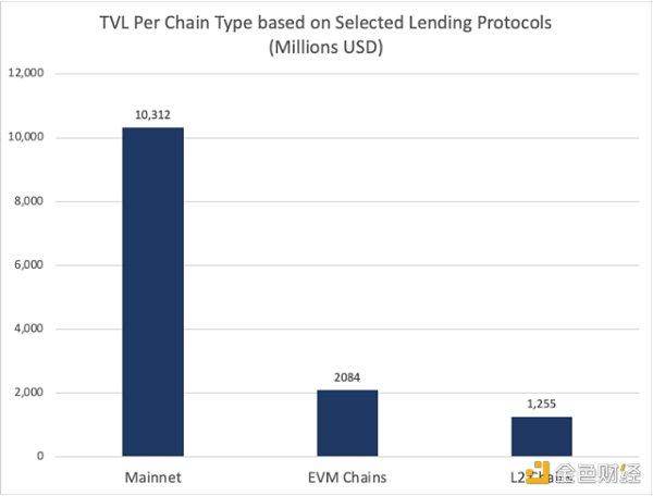 大部分借贷 TVL 驻留在主网上,但 EVM 和 L2 一直在缓慢占据市场份额。