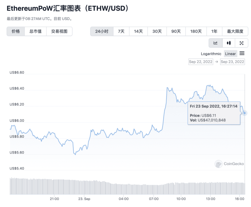 而后在二级交易市场中,由原ETH 1比1映射生成的ETHW代币在短暂上涨后一路下行。9月19日,ETHW最低跌至3.88美元,而后反弹至5.15美元左右,相较上线当天的高点跌去81.6%。分析人士认为,ETHW大幅下跌的原因,主要是获得代币空投的持有者抛售所致。截至目前,ETHW在过去 24 小时内上涨了 3.68%,当前价格为6.11美元。