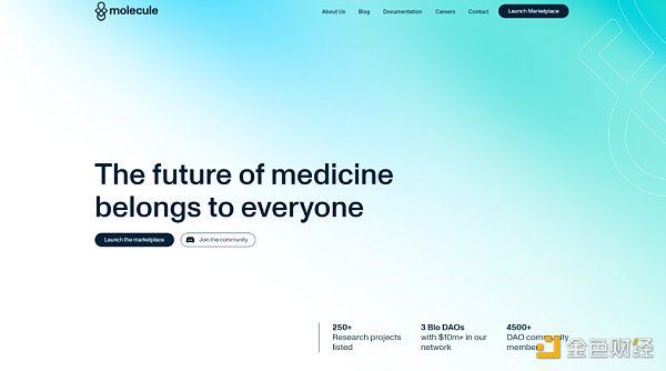 Molecule Project 项目是一个生物技术研究的筹款平台。目前,约有 40 名科学家在该网站上为他们的项目寻找资金。任何人都可以捐赠和支持未来的重要发现。在创立之初,Molecule 受到了公民科学运动和药物开发开放化的启发,最初的想法来源于患者社区,旨在跨越理论与临床研究的死亡谷。项目最初的想法是利用区块链工具帮助推进和资助早期药物开发。为此,Molecule 公司做出了几项决定,这几项决定推动了 DeSci 领域的发展,其中包括构思知识产权 NFT、与知识产权相关的 NFT(药物或基于研究的知识产权),以及启动 VitaDAO 社区以资助长寿研究。