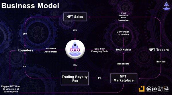 每个项目的创建都将创建一个系列的 NFT 来进行该筹款活动。该类行为我们统称为 INO(Initial NFT Offering) ,NFT 公募将为提议的项目提供资金。NFT 将为意向投资者提供早期投资该产品的机会。其中 NFT 销售所得资金的百分之九十将由募资项目获得,而其余的百分之十则回到 The Science DAO 作为资金储备。而 NFT 交易中设置有百分之六的版税,其中百分之四归项目方所有,百分之二归社区。