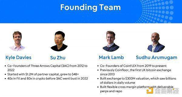 最值得关注的非联合创始人莫属,三箭资本的两位联创 Su Zhu、Kyle Davies,以及 CEX 平台 CoinFLEX 的两位联合创始人 Sudhu Arumugam 和 Mark Lamb 四个头像印在资料上非常瞩目,三箭暴雷众所周知,CoinFLEX 交易平台同样已于去年 8 月宣布破产重组。