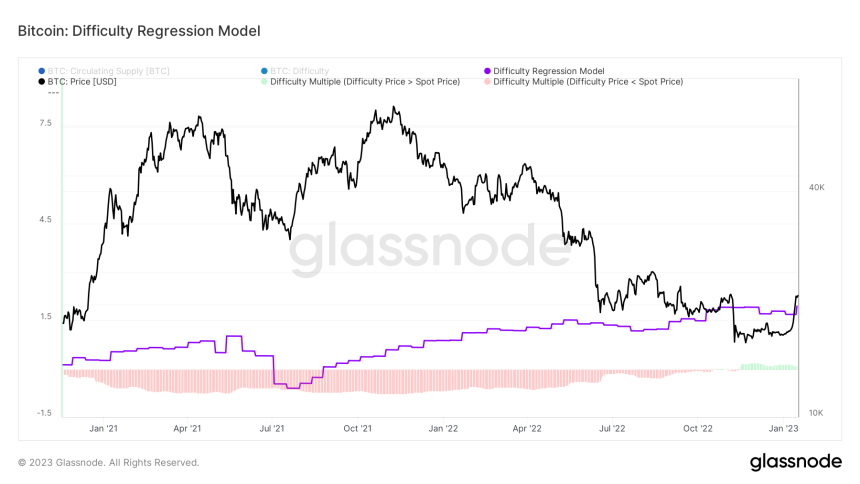 附带的图表显示了其专有的“难度回归模型”,该模型被描述为“比特币的估计全部持续生产成本”。