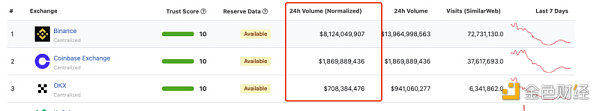 截止 11 月 16 号 2PM UTC+8, Uniswap V3 的 24h 交易量超过了 OKX,在 CEX 中可以排名第三,仅次于 Binance,Coinbase。