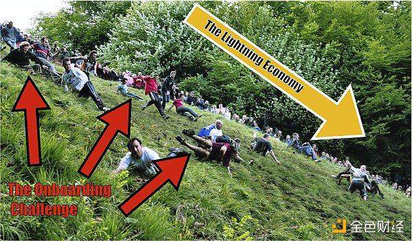 在我们思考引导用户进入的挑战时,应当谨记的是,许多用户不会来自比特币,而是 直接从法币系统 过来的。所以他们需要别人指引他们进入闪电网络。