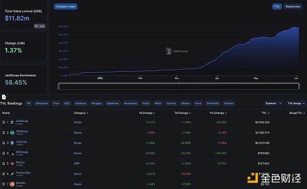 Starknet DeFi 的 TVL 只有 1100 万美元(相比之下,Uniswap 超过 35 亿美元)。