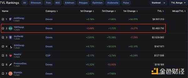 10kSwap 是一个 v2 AMM,代表着 Starknet 中根据 TVL 排名第二的协议。唯一参与该协议的方法是在平台上进行交换和提供流动性。