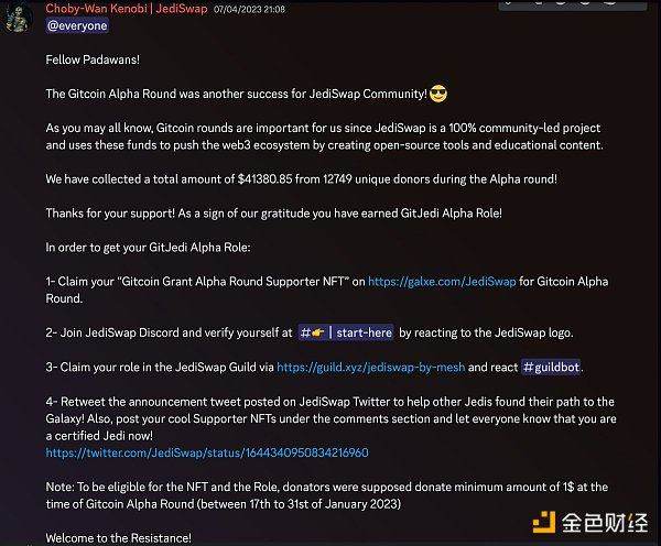 参加 JediSwap 的 Gitcoin 活动。他们会为参与者分发 NFT 和角色。