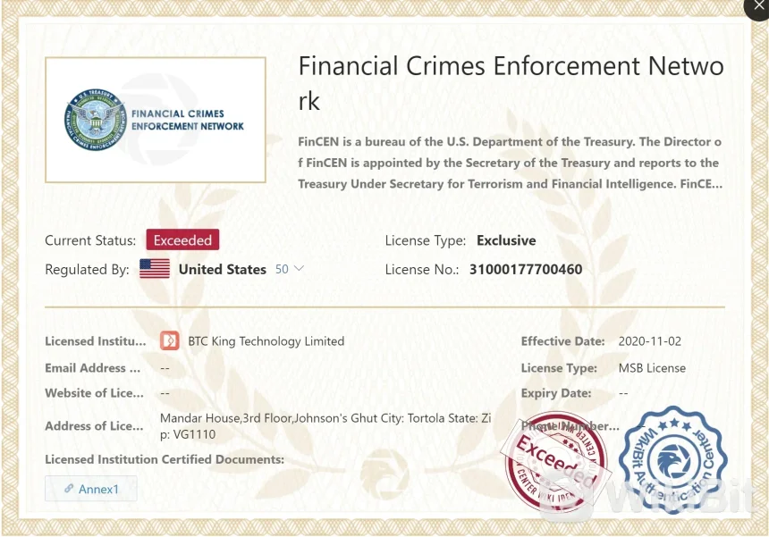 BKEX受美国财政部下属机构金融犯罪执法网络(FinCEN)监管。然而,BKEX的监管状态超过。目前,BKEX持有独家许可证号码31000177700460。