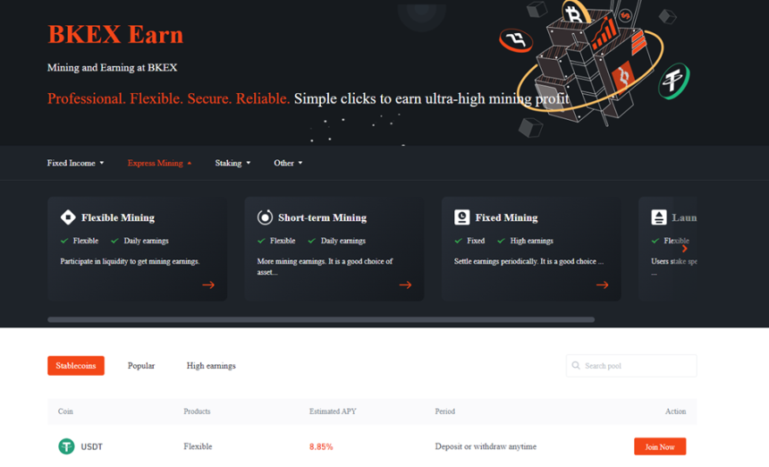 部分BKEX Earn,Express 挖矿 允许用户通过选择超过20个矿池,参与短期挖矿,固定挖矿,Launchpool和灵活挖矿来获得每日奖励。