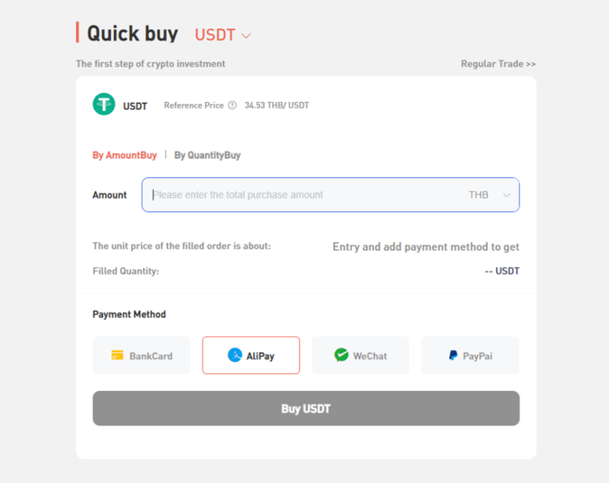 一旦实名认证验证通过,用户可以选择他们想要购买的加密货币。输入所需的加密货币,并选择交易的首选付款方式。BKEX提供四种付款选项:银行卡、支付宝、微信和PayPal。