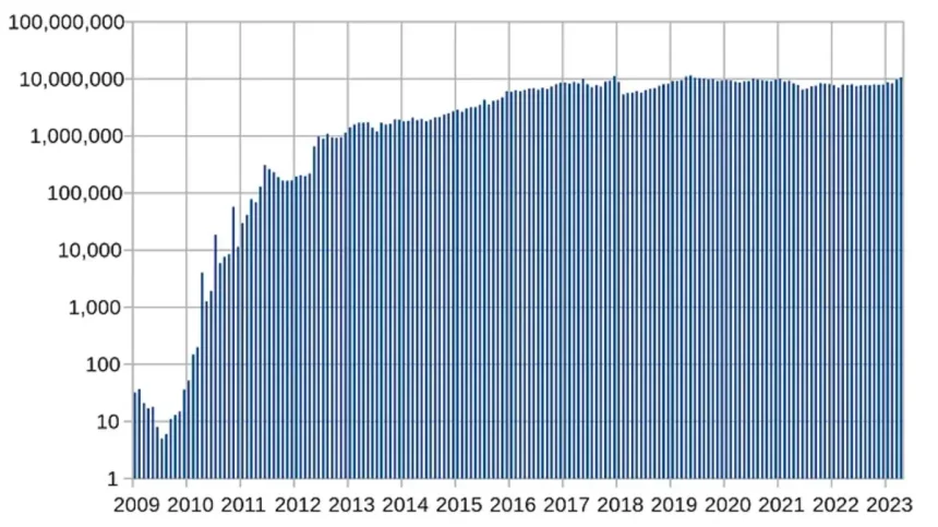 River 是一家专门从事金融服务和比特币技术的公司,其新数据显示,仅在过去两年,闪电网络交易量就增长了令人难以置信的数字,超过 1,200%。River 于 10 月 12 日发布的报告旨在反驳有关闪电网络的神话。从 2021 年开始,该协议的活跃使用量远非停滞或停滞不前,而是大幅上升。River 估计,每月用户数量在 27.9 万到 110 万之间,这个庞大的数字由于难以衡量私人交易和介于两者之间的交易而变得复杂。