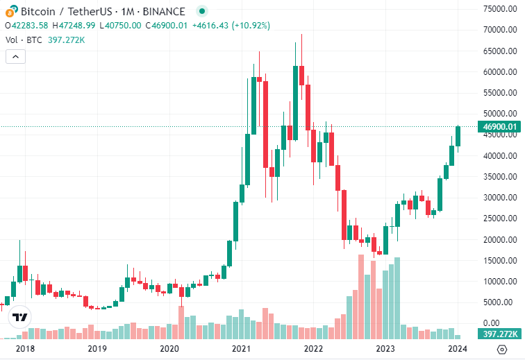 在此背景下,比特币价格站上47000美元关口,创下了 2022 年 4 月以来的 21 个月新高。