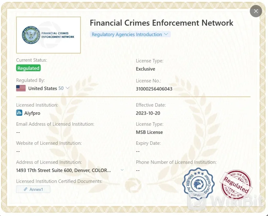 Aiyfpro 受到美国金融犯罪执法网络(FinCEN)的监管和授权,许可证号为31000256406043。拥有这个许可证意味着Aiyfpro已成功完成了严格的监管程序,并得到了美国著名监管机构FinCEN的官方认可。FinCEN的主要目标是通过防止非法活动、打击洗钱行为和为国家做出贡献来保护金融体系的完整性security。