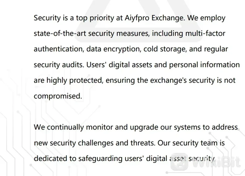Aiyfpro 被认为是在 exchange 方面最好的。通过采用这些先进的 security 协议,Aiyfpro 确保用户的资金免受潜在的黑客攻击,并且他们的个人数据得到高度保护。