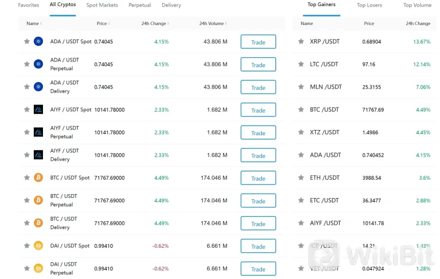 Aiyfpro 提供了多种选择的超过19种加密货币进行交易,包括流行的选项如SHIB, DOGE, XRP, ADA, 和 VET。这些加密货币代表了数字资产领域内的一系列项目、技术和社区,满足不同的投资偏好和交易策略。