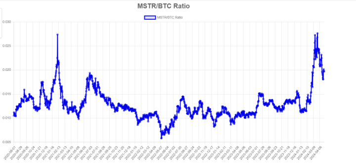 来自 MSTR 跟踪器的数据显示了“MSTR/BTC 比率”图表,该图表说明了 MicroStrategy 股价与比特币价格之间的比较价值,其峰值约为 0.028,与 2021 年的高点相似,但此后已降至 0.02。