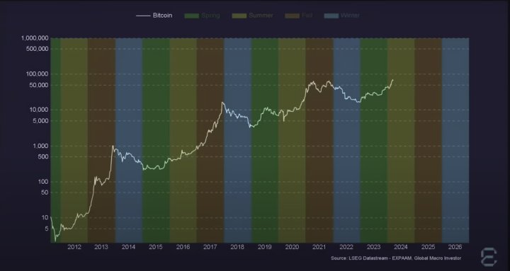 Pal 还预测,加密货币市场将出现类似于 2013 年和 2017 年周期的“加密货币下跌”,当时市场延续反弹甚至走高。许多分析师认为,加密货币以四年为一个周期,并将周期分为一年中的四个季节来解释不同的阶段。