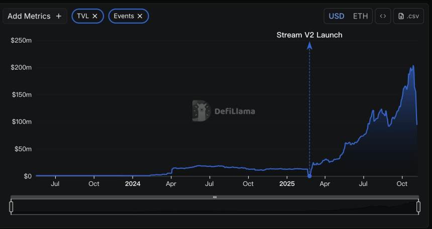 Stream Finance 正是这种不透明操作的典型。根据链上数据分析,Stream 声称拥有高达 5 亿美元的总锁仓价值(TVL),但根据 DeFillama 数据,Stream 的 TVL 在最高点仅有两亿。