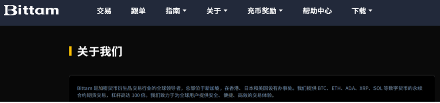 Bittam交易所共有148个交易对,全部是数字货币的永续合约产品。Bittam宣称“Bittam 是加密货币衍生品交易行业的全球领导者,总部位于新加坡,在香港、日本和美国设有办事处。”
