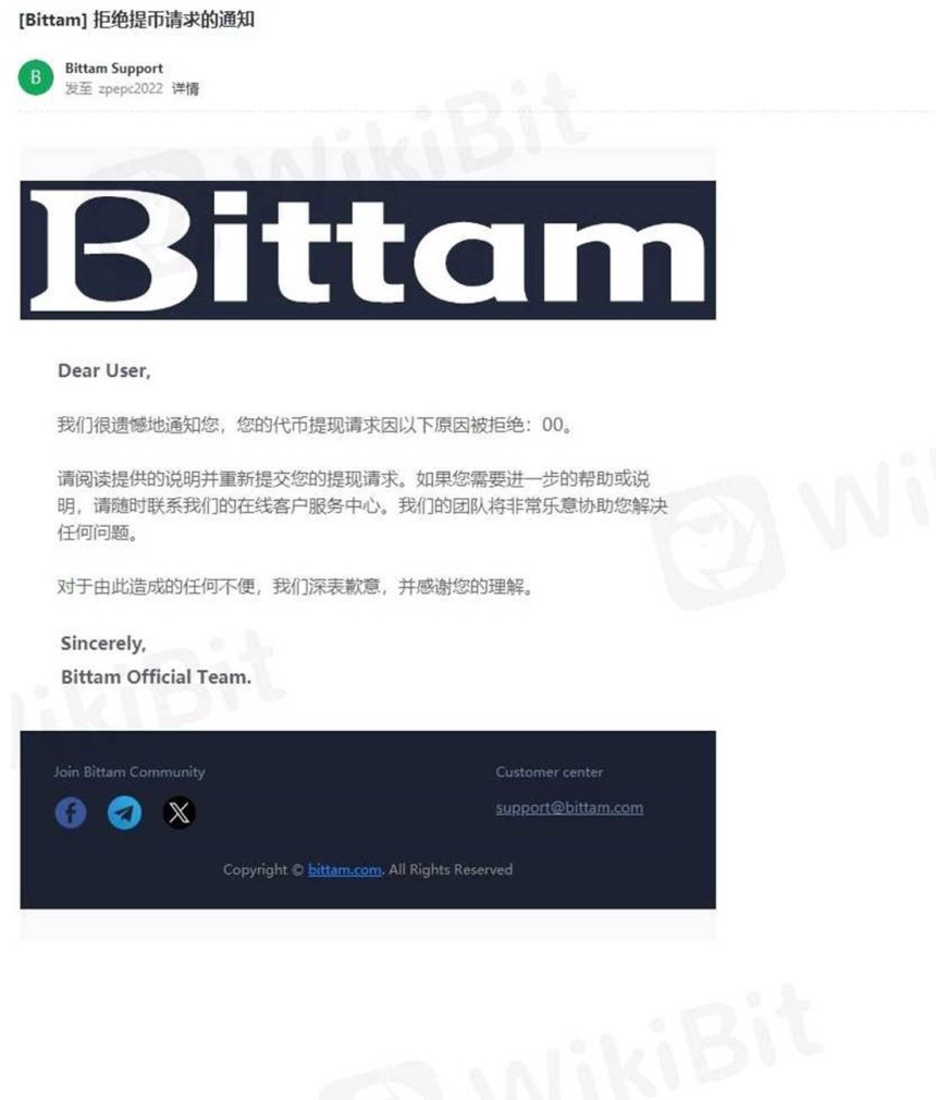 吴小晶提交提币申请被拒,Bittam平台给的理由是“00”,具体拒绝的理由都懒得说,这情形更像是系统自动判定并回复的。