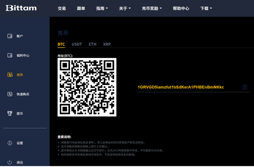 Bittam客户管理后台只有虚拟货币充币一种入金途径,合计5个充币地址,目前查到的数据显示仅有约5美元的交易,当前总余额约1.5美元。(不排除该平台曾使用其它地址)