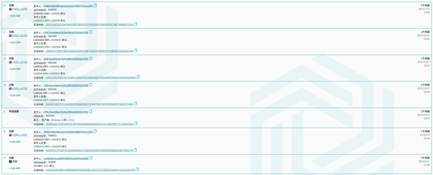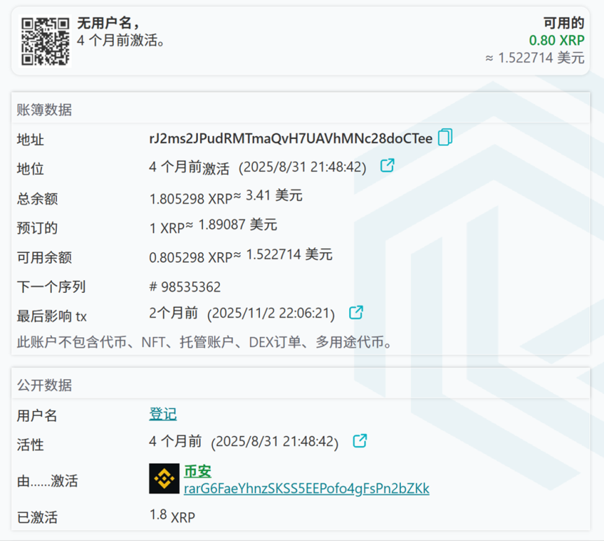 XRP充币地址今年8月31日激活,可用余额约1.5美元,至今共7笔交易,合计总金额约5美元(如下图)。
