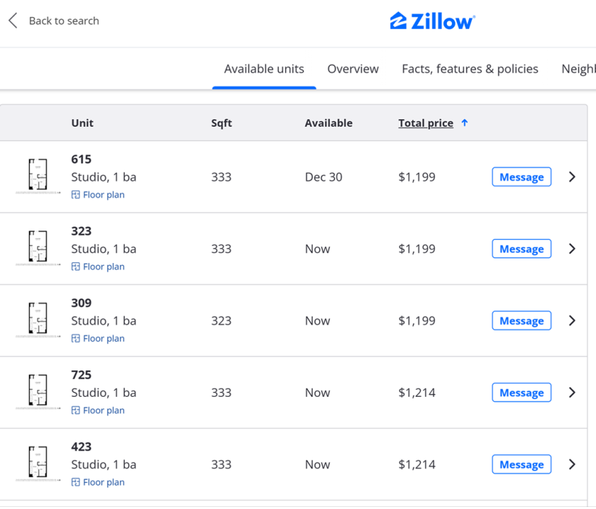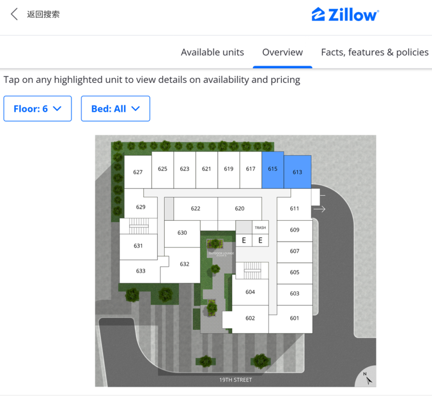 根据Zillow房产网站的信息,该栋公寓常见户型面积约为 323–444 平方英尺(约30-41平方米),月租金常见区间 $1,199–$1,800。