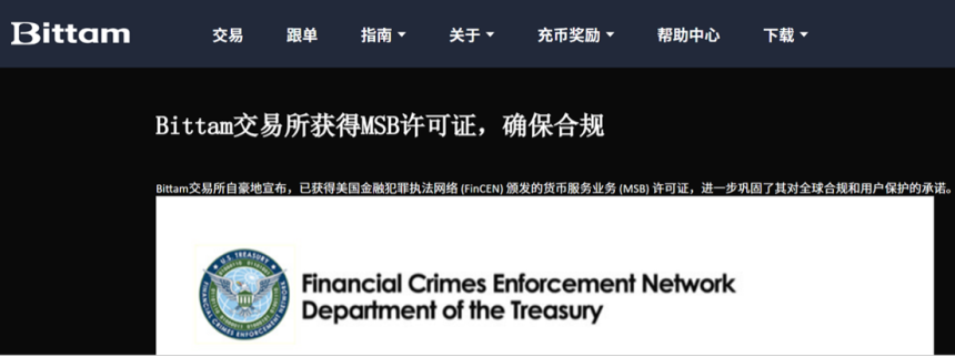 Bittam在其官网很自豪的宣布,获得MSB许可证。但MSB(货币服务企业)只是一个公开登记信息库,并不代表政府背书。