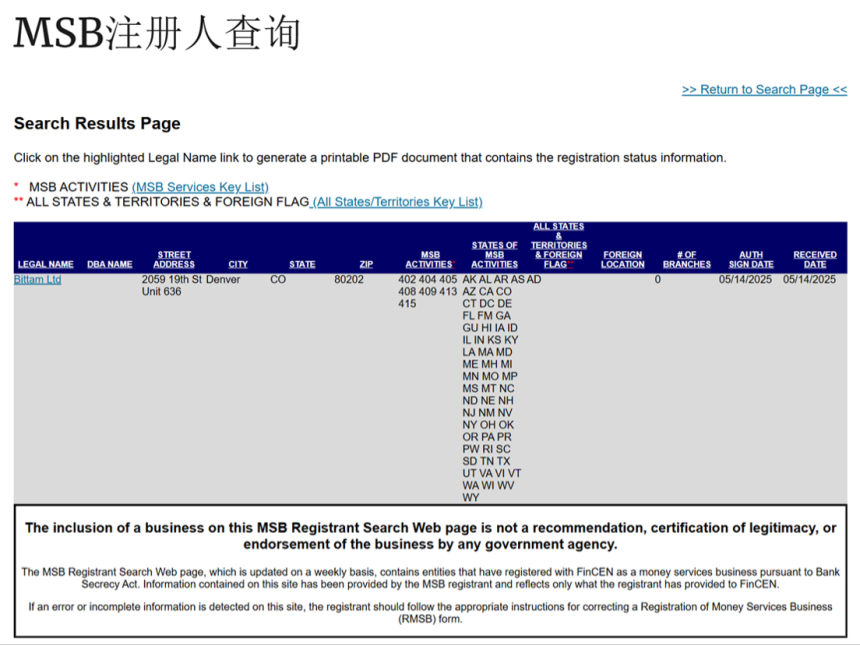 通过美国财政部金融犯罪执法局(FinCEN)的MSB注册人查询,确实能查到Bittam Ltd,查询结果与具体文件如下图所示。签署日期和接收日期为2025年5月14日,这天是Bittam Ltd成立第二天。