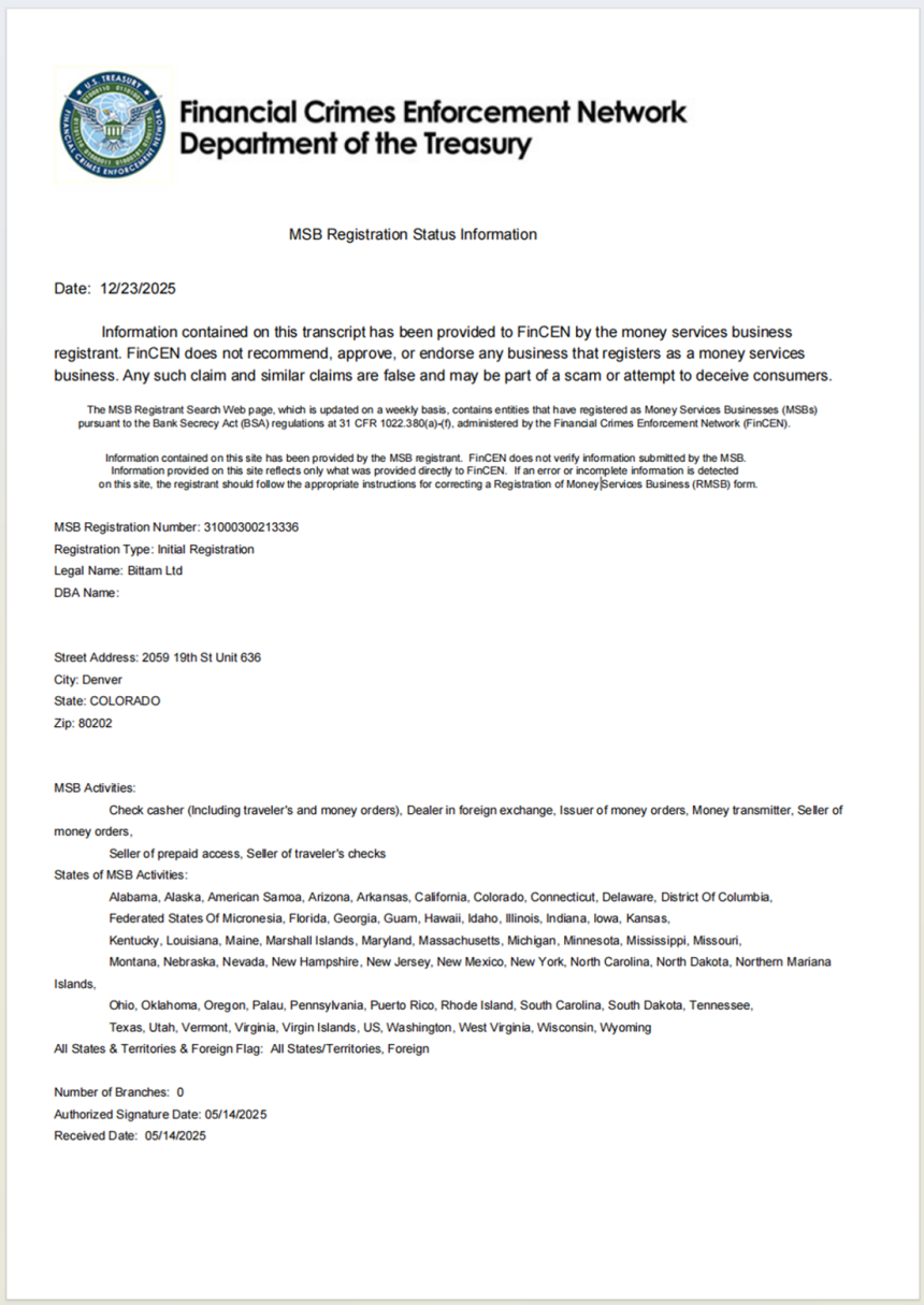 具体文件开头特别强调:这份记录中所包含的信息是由Bittam Ltd提供给金融犯罪执法网络(FinCEN)的。FinCEN并不推荐、批准或认可任何注册为MSB的公司。任何此类声明及类似声明均为虚假内容,可能属于诈骗行为或旨在欺骗消费者的企图。FinCEN不会对由货币服务业务注册人提交的信息进行核实。本网站所提供的信息仅反映直接提交给FinCEN的内容。