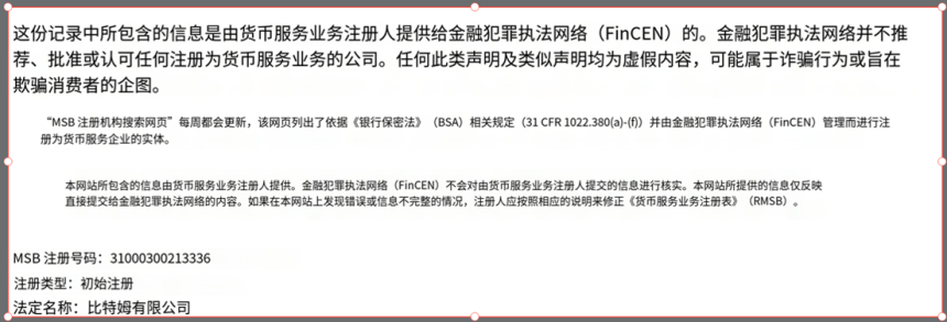 根据FinCEN提示所知,不管MSB数据库上Bittam Ltd的业务包含多少类别,均是完全由Bittam Ltd自己提交的,FinCEN并不认可也不会核实信息。对投资者而言,在MSB登记跟监管牌照授权或者许可证没什么关系,也不会有任何投资者保护方面的相关规定。尤其避免此类误导。