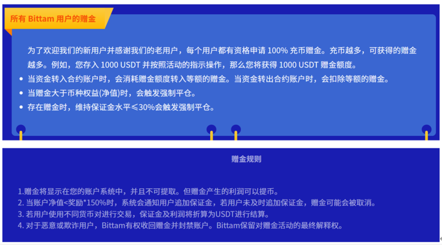 对投资者而言,这相当于增加了杠杆,对于高杠杆用户可以提高资金利用率。但还有个规则:“对于恶意或欺诈用户,Bittam有权收回赠金并封禁账户。Bittam保留对赠金活动的最终解释权”。这与用户协议类似,规则4赋予Bittam封禁账户极大的自主权。